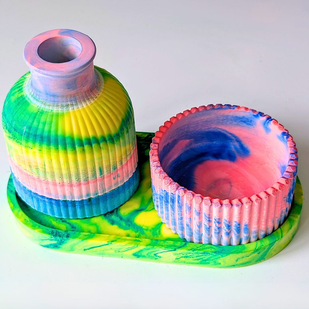 It's perfect for beginners and our marbelux starter kit comes with the moulds to make a striped vase, oval tray and a striped candle holder. Everything in the kit is totally reusable and all you will need next is more marbelux to keep crafting!